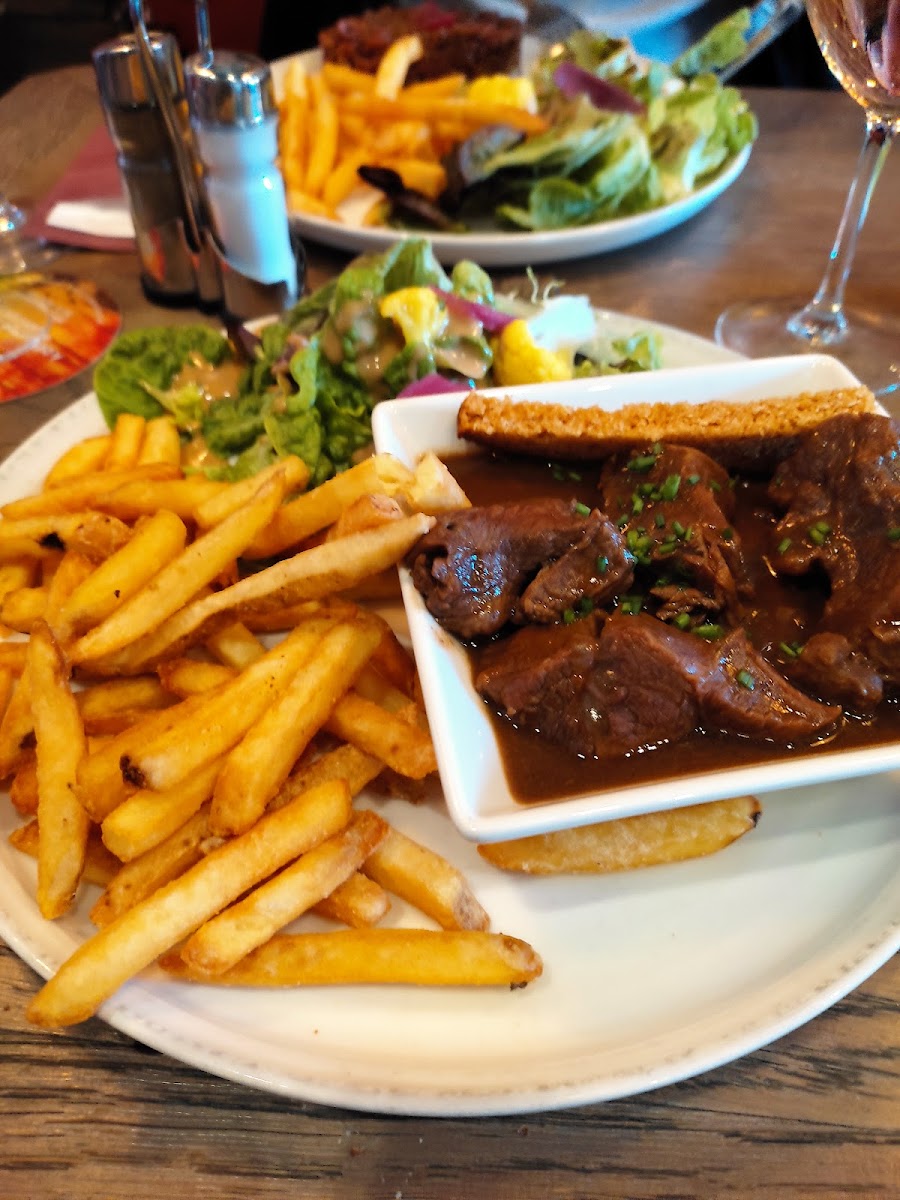 1. Definitely dog-friendly, including inside seating. 2. A highly welcoming staff, both on site and over the phone. 3. Clean and spacious, including toilets and parking spaces. 4. OK entrecôte, cooked as ordered, served with unlimited sauces. 5. OK price/quality ratio with regard to the house red wine. 6. Free Wi-Fi (albeit out of service today, the servers being unable to restart the router). 7. Currently, free charging station on the parking area near-by. 8. Currently, mighty patriotic decor due to the Euro-2020. 9. Non-stop service, inclusive of the kitchen. 10. Exceptional 1980s-1990s playlist, tending towards the slow-mo/down-tempo/romantic sides.